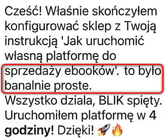 Cześć! Właśnie skończyłem konfigurować sklep z Twoją instrukcją. To było banalnie proste. Wszystko działa, BLIK spięty. Uruchomiłem platformę w 4 godziny! Jak siadłem to mnie wessało. Dzięki! PETARDA🚀